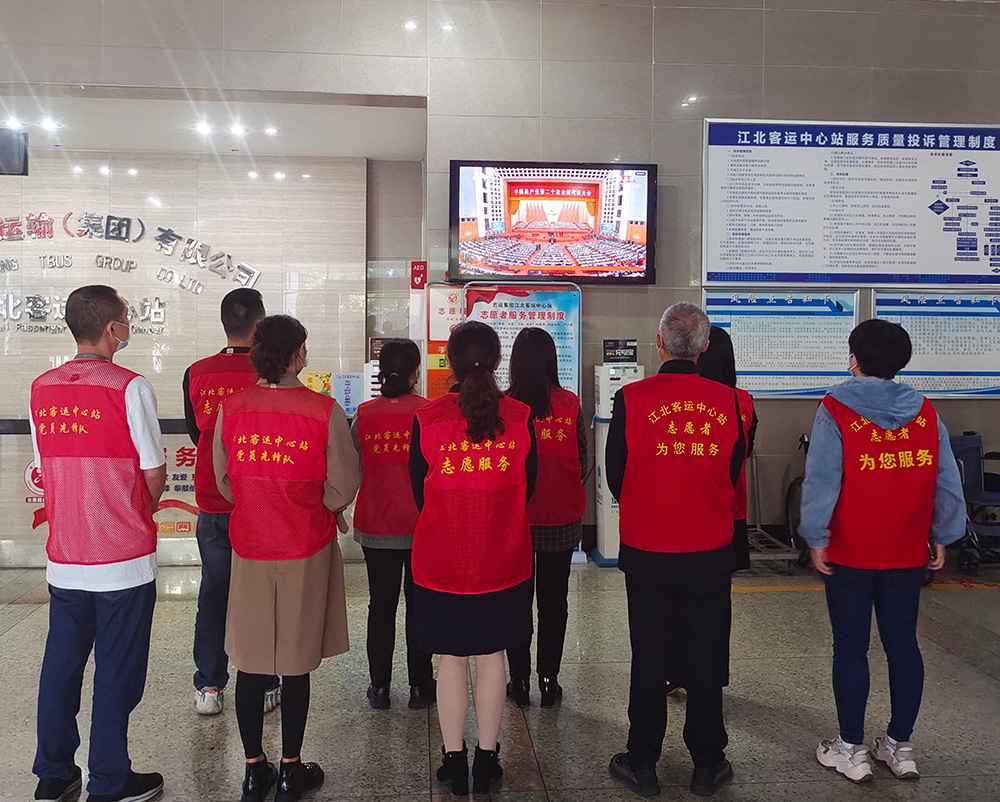 巴运集团江北客运中心一线职工换班时间收看党的二十大开幕会