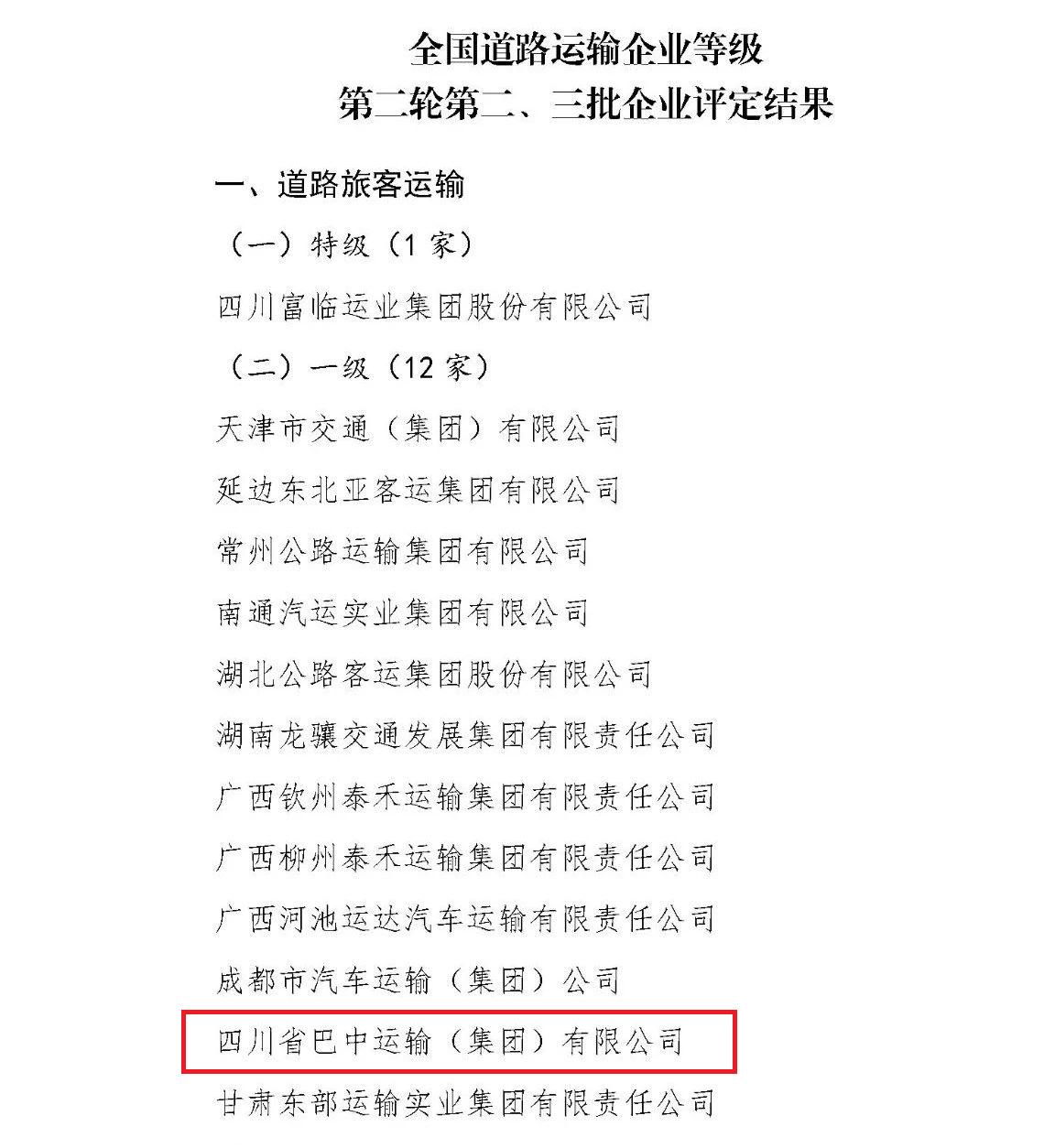 四川省巴中运输(集团)有限公司 获评全国道路旅客运输一级企业